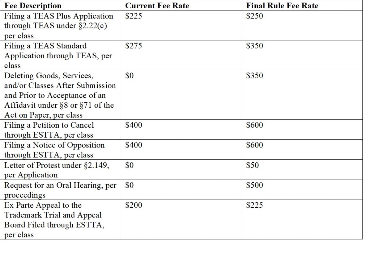 Application fees have gone up across the board. TEAS Standard application fees have gone from $275 per class to $350 per class. TEA Plus application fees have gone from $225 per class to $250 per class. Fees have also increased for TTAB cancellations and oppositions, as well as TTAB trial and appeals. The increased fees will better align the fees with the associated cost for the USPTO.